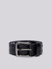 Belt made of patterned leather with all-over embossed studs. Squared buckle with shiny finish and customized writing on the lower edge. Height 3 cm.